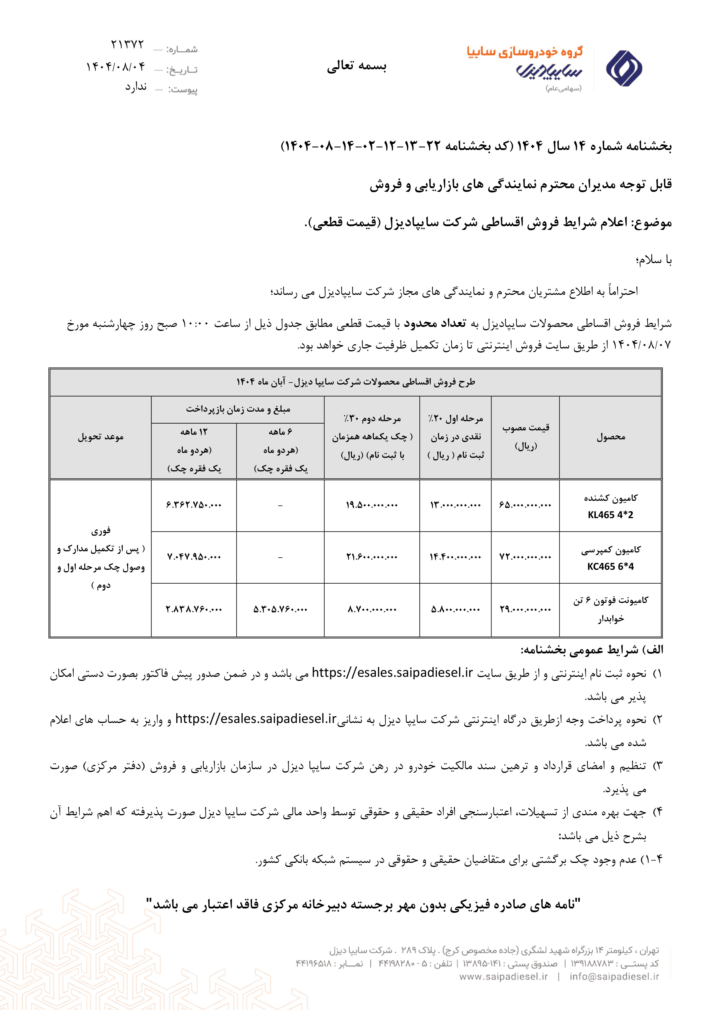 ثبت نام نقدی و قسطی سایپا دیزل: آبان 1404