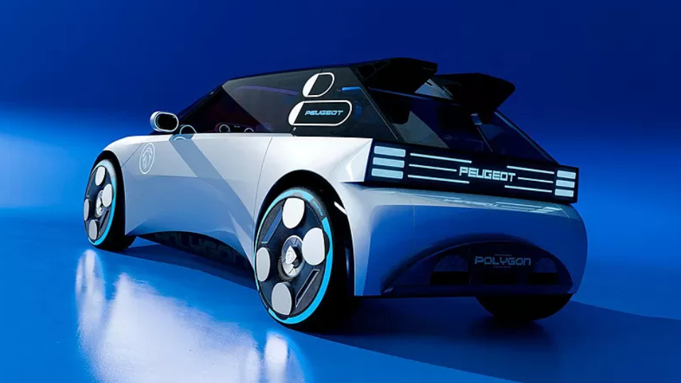 در پایین سپر جلو یک ورودی هوا وجود دارد؛ این ورودیها یک نوشته بزرگ برند را تشکیل میدهند. در زیر آن یک اسپلیتر ساخته شده از پلاستیک مشکی پیانویی قرار دارد. قوس چرخها، قسمت پایینی پنلهای کناری و اسپویلر دو تکه نصب شده در بالای درب عقب نیز به طور مشابه طراحی شدهاند. یک عنصر مشکی نیمدایرهای که نام کانسپت را دارد، در عقب دیده میشود و در زیر خط پنجره یک تک چراغ با الگوی نوری متشکل از خطوط مختلف و نام برند وجود دارد. پژو Polygon همچنین دارای چرخهای غیرمعمول است که با تایرهای گودیر کمارتفاع با رینگهای آبی همراه شدهاند.